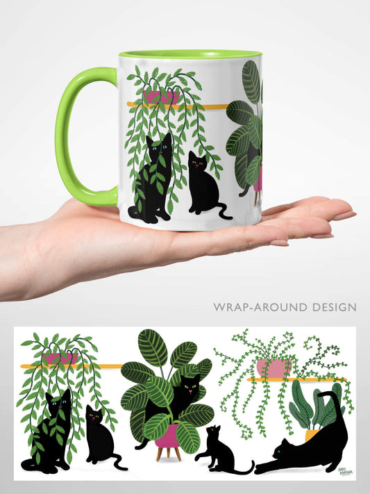 Plant Kitties (black cats, lime green accents) – ceramic mug