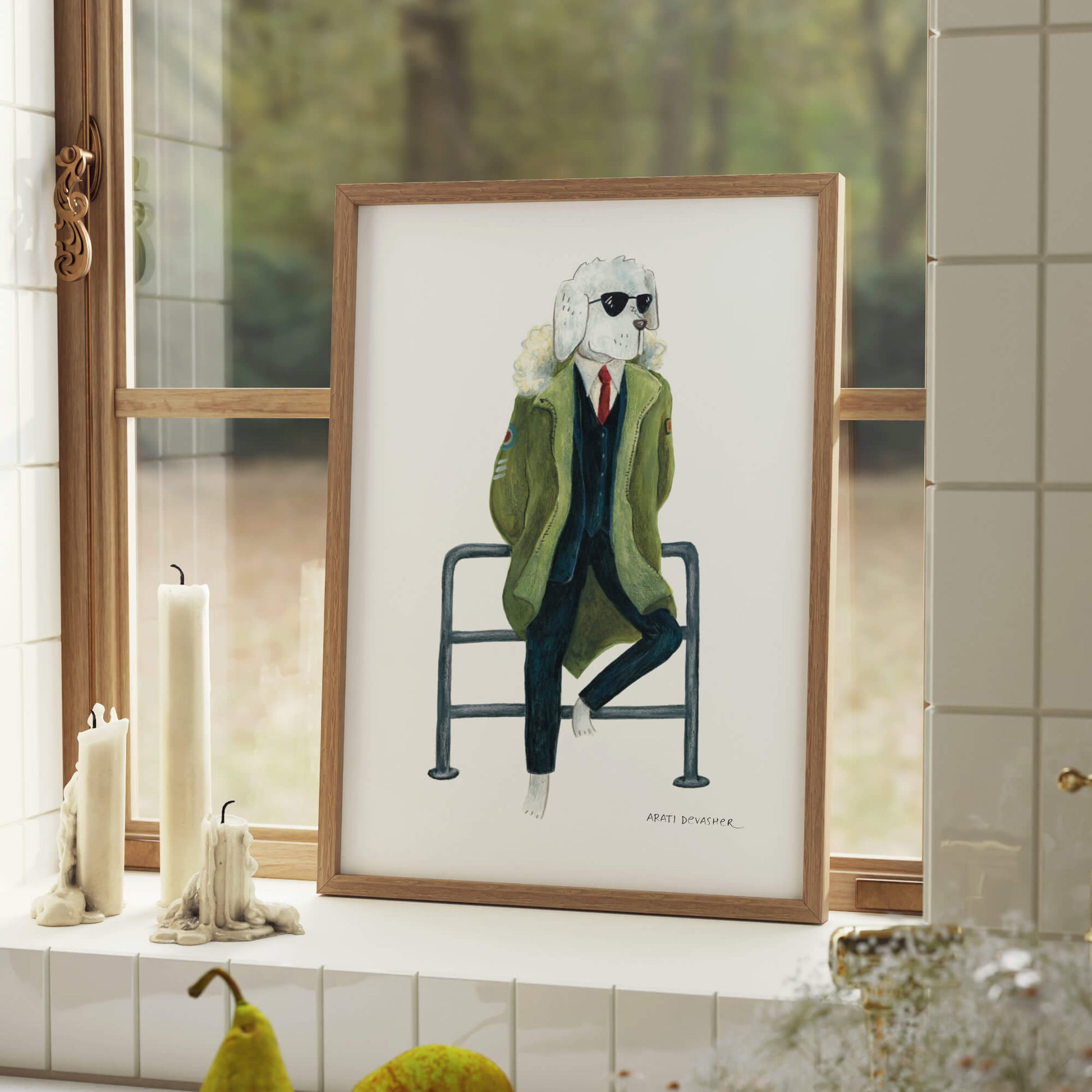 A Great Dane sporting Mod fashion and looking super cool with his aviators on! He is dressed in a classic 60s suit with a spearpoint collar shirt and a fishtail parka and patches.
