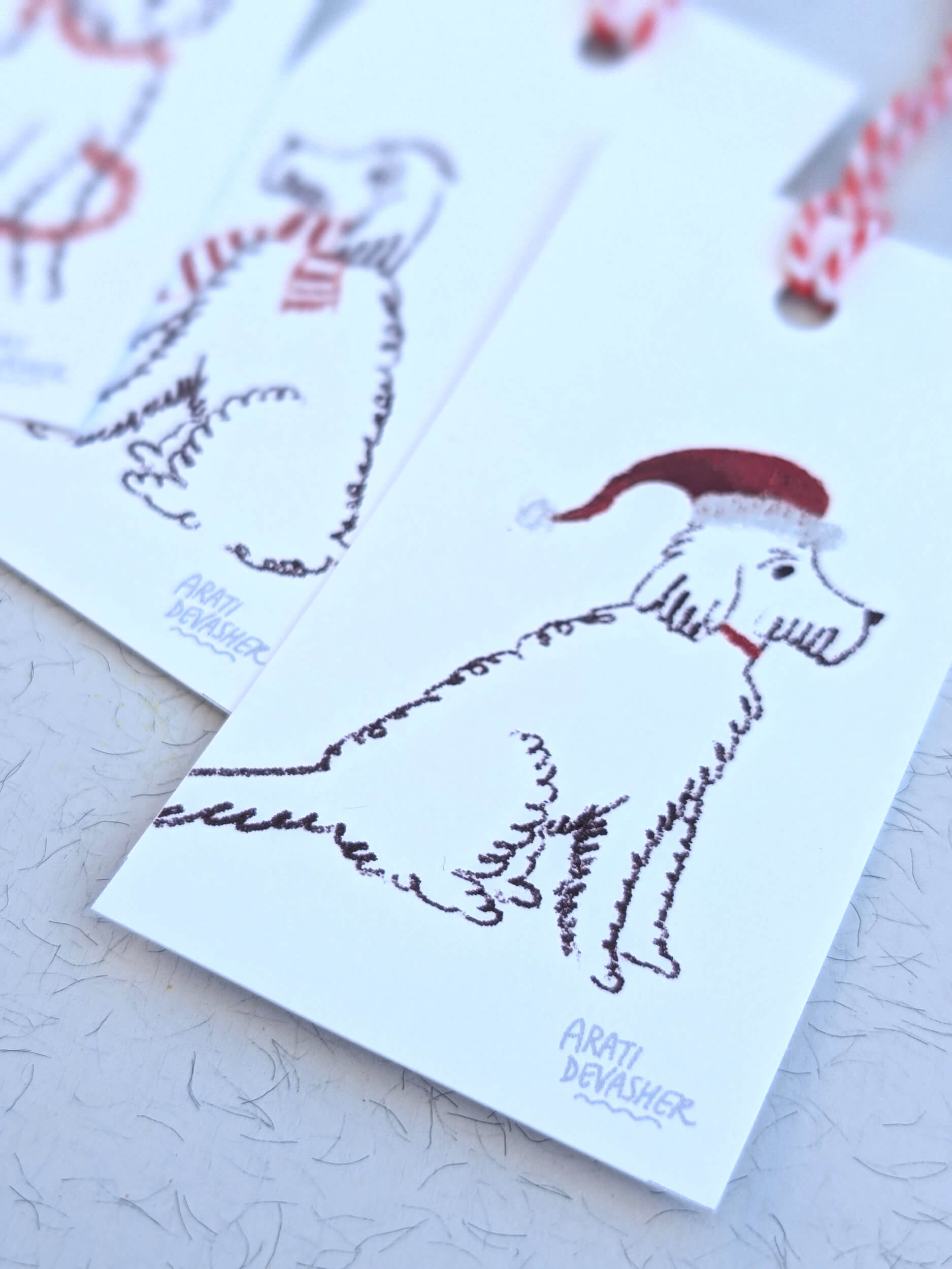 A set of four gift tags, each featuring an illustration inspired by my own labradoodle, Sam. Add a bit of festive cheer to your pressies this year with these furry floofs, adorned with bows, scarves, tinsel and a Santa hat!