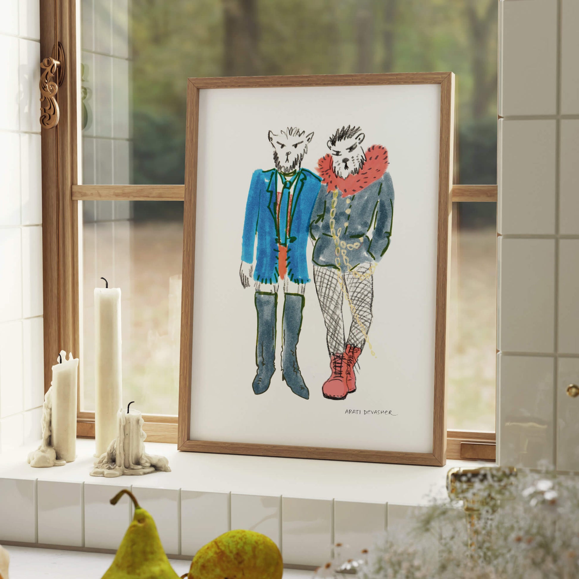 Bring a burst of vibrant colour to your home decor with this art print of dog sporting a punk-style outfits. This quirky illustration, straight from the pages of my sketchbook, adds a playful touch to any space.